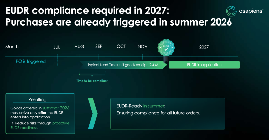 A purchase order is placed months before goods arrive, and compliant documentation has to exist before shipment and customs processes start pulling it. That’s why EUDR readiness needs to be planned backwards from your real supply-chain cycle: order → lead time → inbound goods, with supplier data and due-diligence evidence running ahead of the flow.
