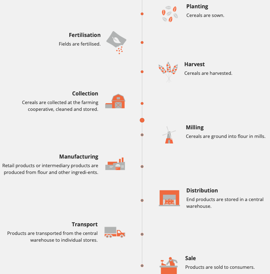A typical supply chain in the cereals industry is depicted below. The individual processing steps can differ, depending on the product sold.