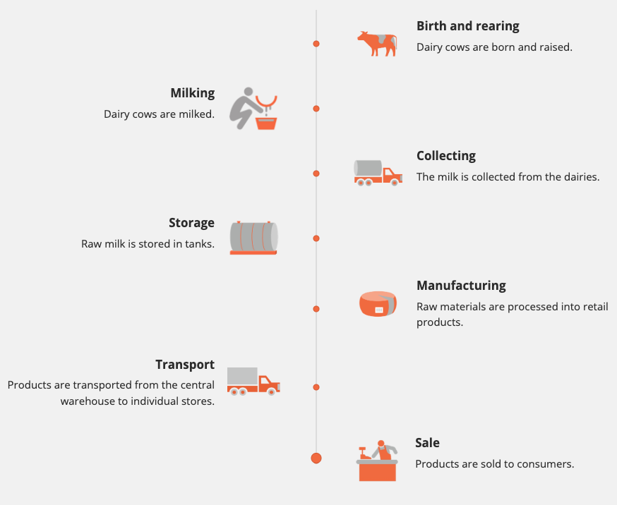 The following diagram shows a typical supply chain in the dairy industry. The individual process steps differ depending on the retail product.