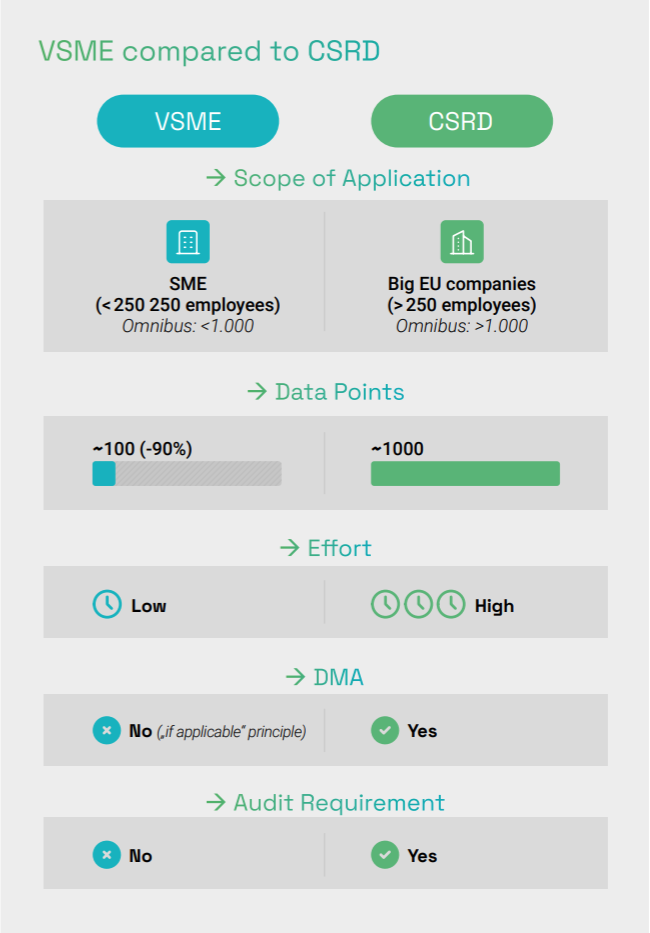 Compared to CSRD, VSME focuses on a clearly limited set of essential disclosures and reduces the number of required data points by up to 90 percent. Sustainability reporting still requires effort. However, the scope remains manageable for SMEs without dedicated teams. VSME is explicitly designed as a starting point, allowing SMEs to begin with a limited scope and expand reporting step by step as requirements or business needs evolve.