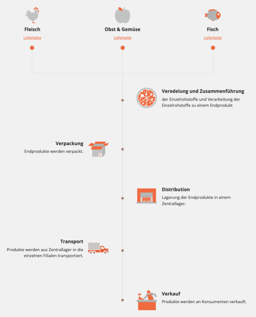 Die Rohstoffe, aus denen sich das Endprodukt zusammensetzt, stammen aus unter-schiedlichen Schlachtungs-, Ernte- oder Fangprozessen. Darauf folgt die weitere Verarbeitung zu Zwischen- oder Verkaufsprodukten.