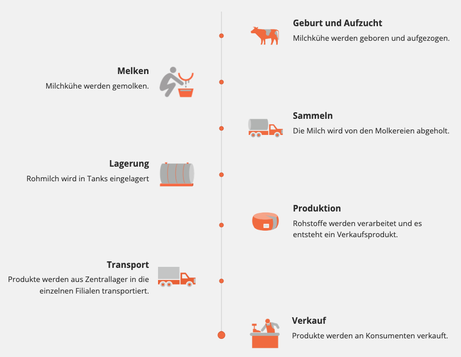 Die folgende Darstellung zeigt eine typische Lieferkette der Molkereibranche. Je nach Verkaufsprodukt unterscheiden sich einzelne Prozessschritte.