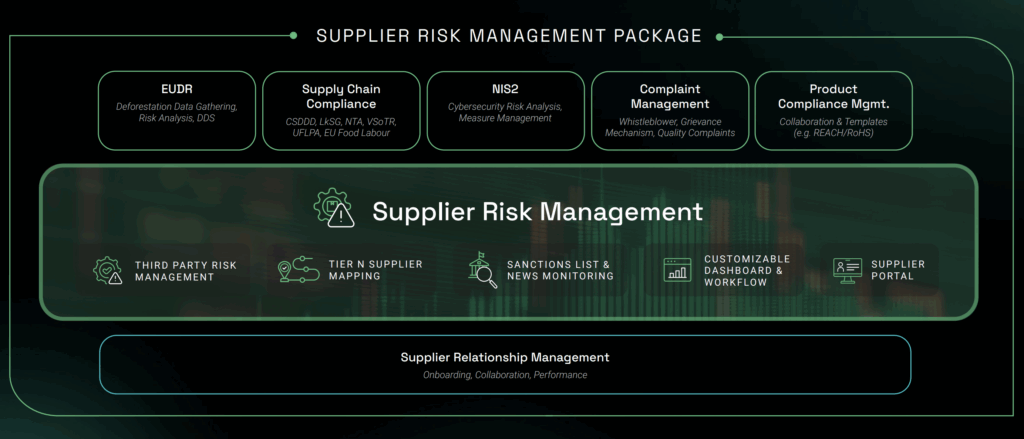 Con dimensiones de riesgo de cadena de suministro predefinidas y marcos de riesgo normativo integrados (incluidos CSDDD, CBAM, NIS 2 y EUDR), ofrece una base sólida pero totalmente personalizable según las políticas específicas, los modelos de puntuación y los requisitos de gobernanza de cada organización. Esta flexibilidad permite a las empresas configurar, ampliar y adaptar la solución a su propio panorama de riesgos, manteniendo la garantía de cumplimiento normativo a escala.