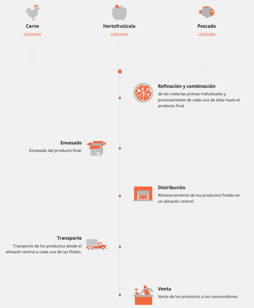 Las materias primas que componen el producto final provienen de diversos procesos de sacrificio, cosecha o captura. A continuación, se lleva a cabo el procesamiento posterior para la fabricación de productos intermedios o finales.