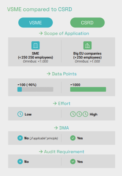 En comparación con la CSRD, el VSME se centra en un conjunto claramente limitado de divulgaciones esenciales y reduce el número de puntos de datos obligatorios hasta en un 90%. El reporting de sostenibilidad sigue requiriendo esfuerzo. Sin embargo, el alcance se mantiene manejable para pymes sin equipos dedicados. El VSME está diseñado explícitamente como un punto de partida, permitiendo que las pymes empiecen con un alcance limitado y amplíen el reporting paso a paso a medida que evolucionan los requisitos o las necesidades del negocio.