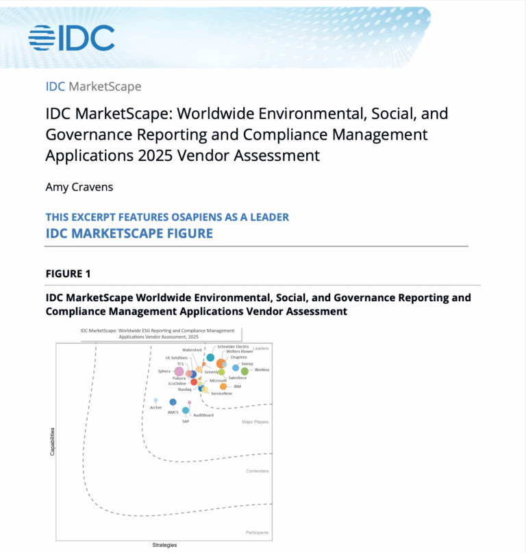 Dans cette évaluation indépendante, l’IDC MarketScape positionne osapiens en tant que Leader dans le domaine des applications de reporting ESG et de gestion de la conformité. Nous pensons que cela reflète la puissance du osapiens HUB – une plateforme intelligente pilotée par l’IA qui réunit 27 solutions pour aider les entreprises à relever des défis réglementaires tels que CSRD, EUDR et CSDDD, tout en accélérant l'efficacité opérationnelle et les progrès en matière de durabilité.