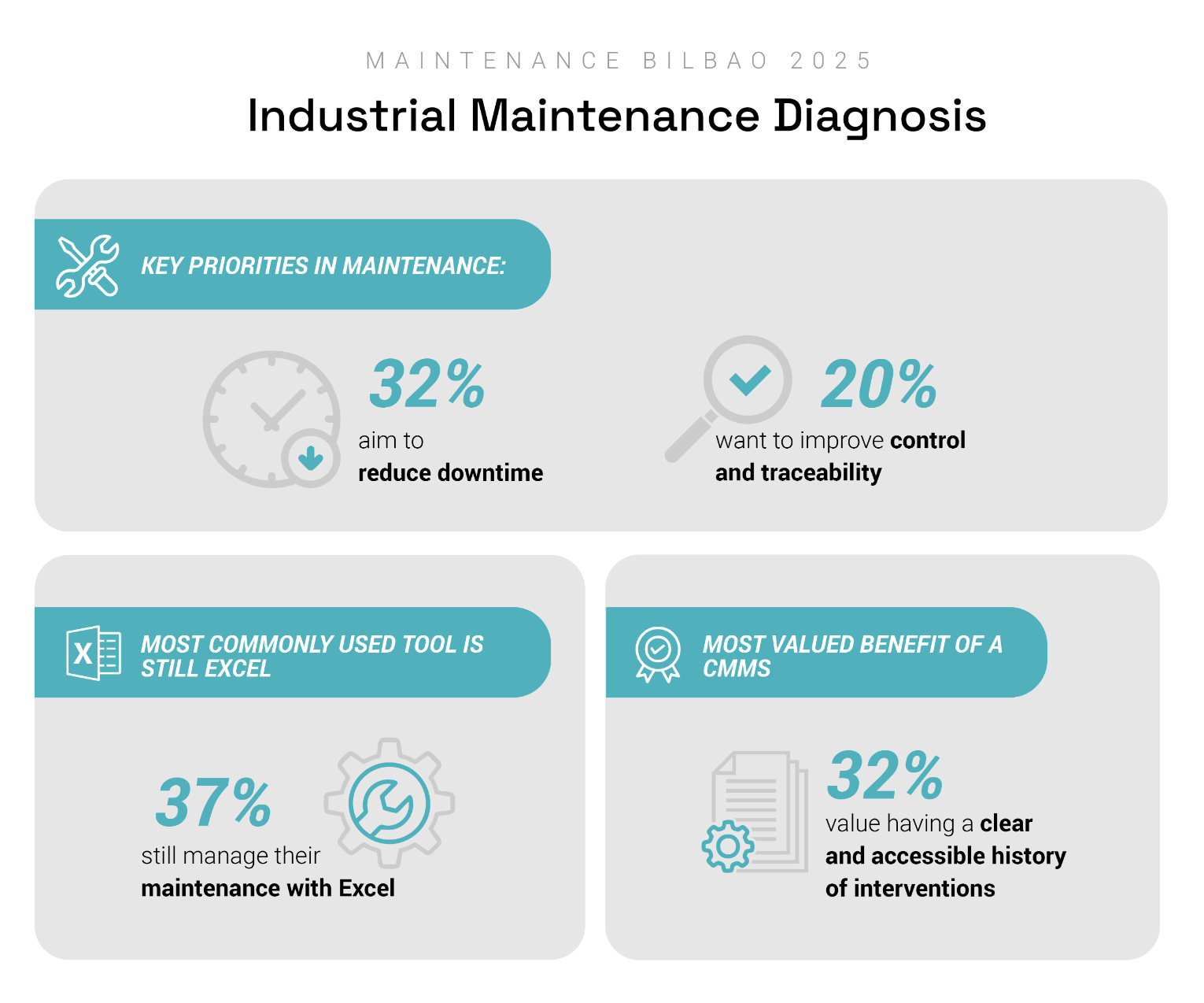 - 37% still manage their maintenance using Excel or Google Sheets, highlighting a huge potential for improvement through specialized and tailored tools.