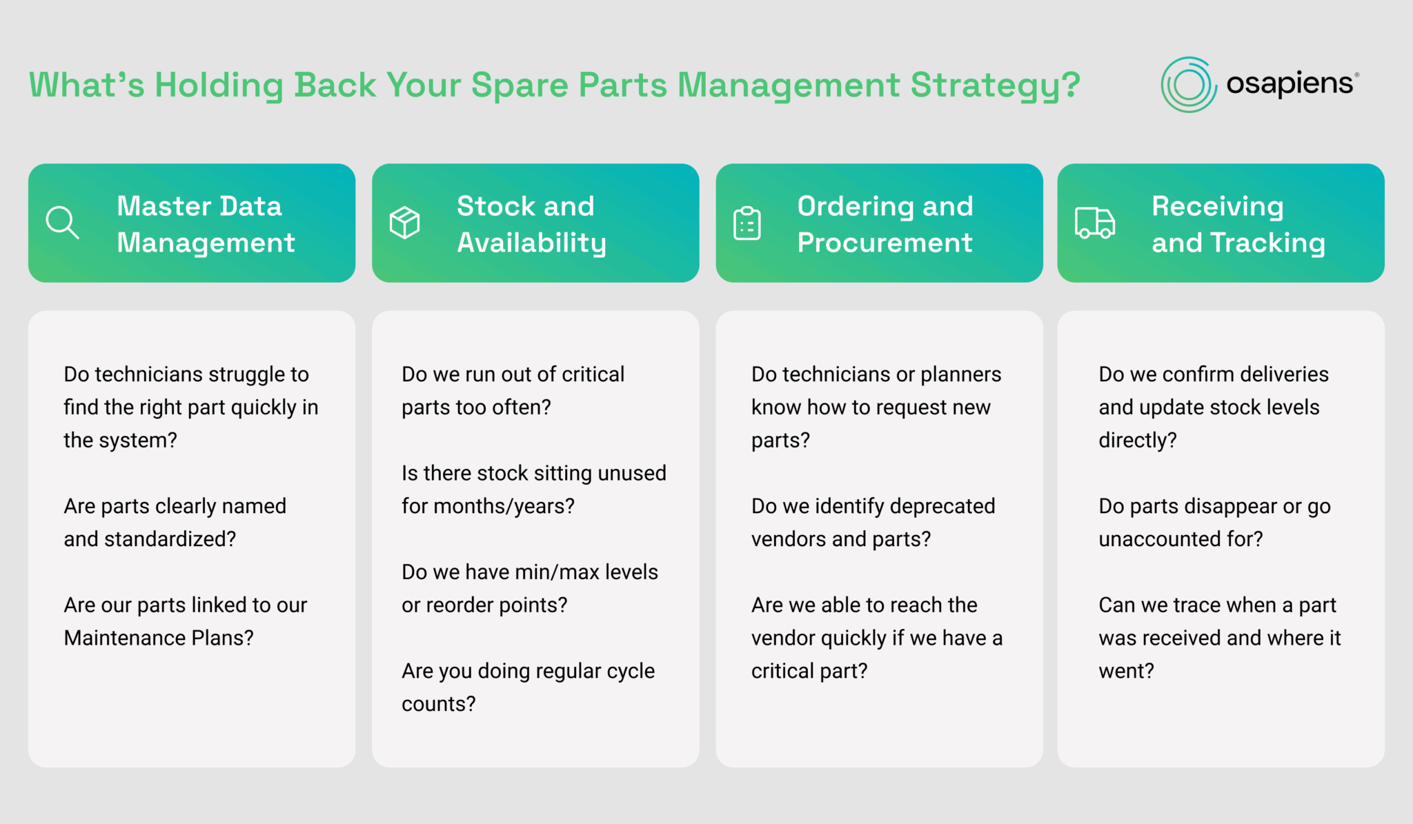 If any one of these elements is missing, it creates friction across the entire maintenance workflow. For a closer look at the key questions to assess your spare parts management, explore the infographic below.