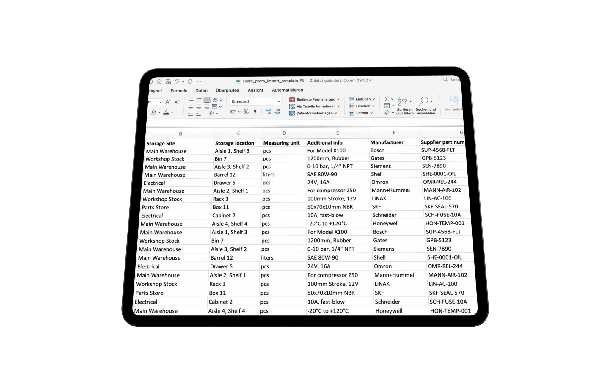- Easy onboarding via Excel imports lets you transfer existing spare parts data using simple spreadsheet templates