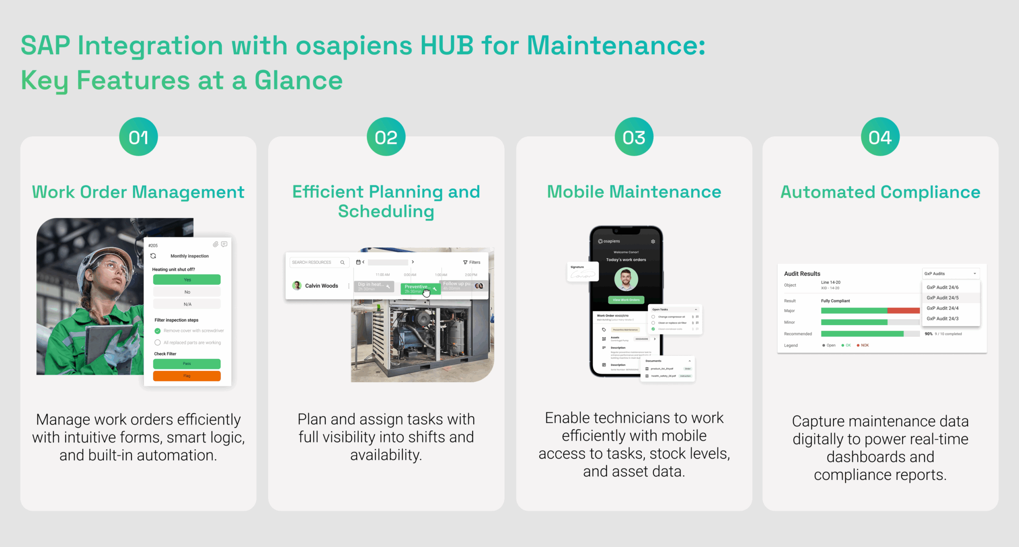 With certified SAP integration, mobile-first design, and intelligent automation, osapiens HUB for Maintenance helps organizations eliminate inefficiencies, reduce downtime, and scale operations with confidence.