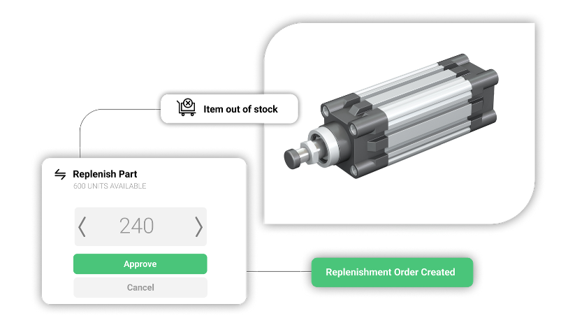 - End-to-end process automation through integrations. For example, automated spare part ordering when stock levels are low, triggered through a direct connection to your procurement system or CRM.