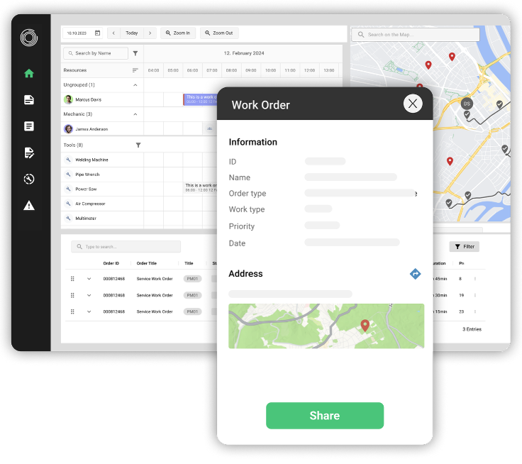 - Planning and scheduling: Drag-and-drop scheduling, skill-based assignment, and multi-level planning capabilities help you to optimize how you use your workforce. These features manage shifts, absences, and schedules while tracking workforce availability in real-time. This ensures the right technicians are assigned to the right jobs at the right time.