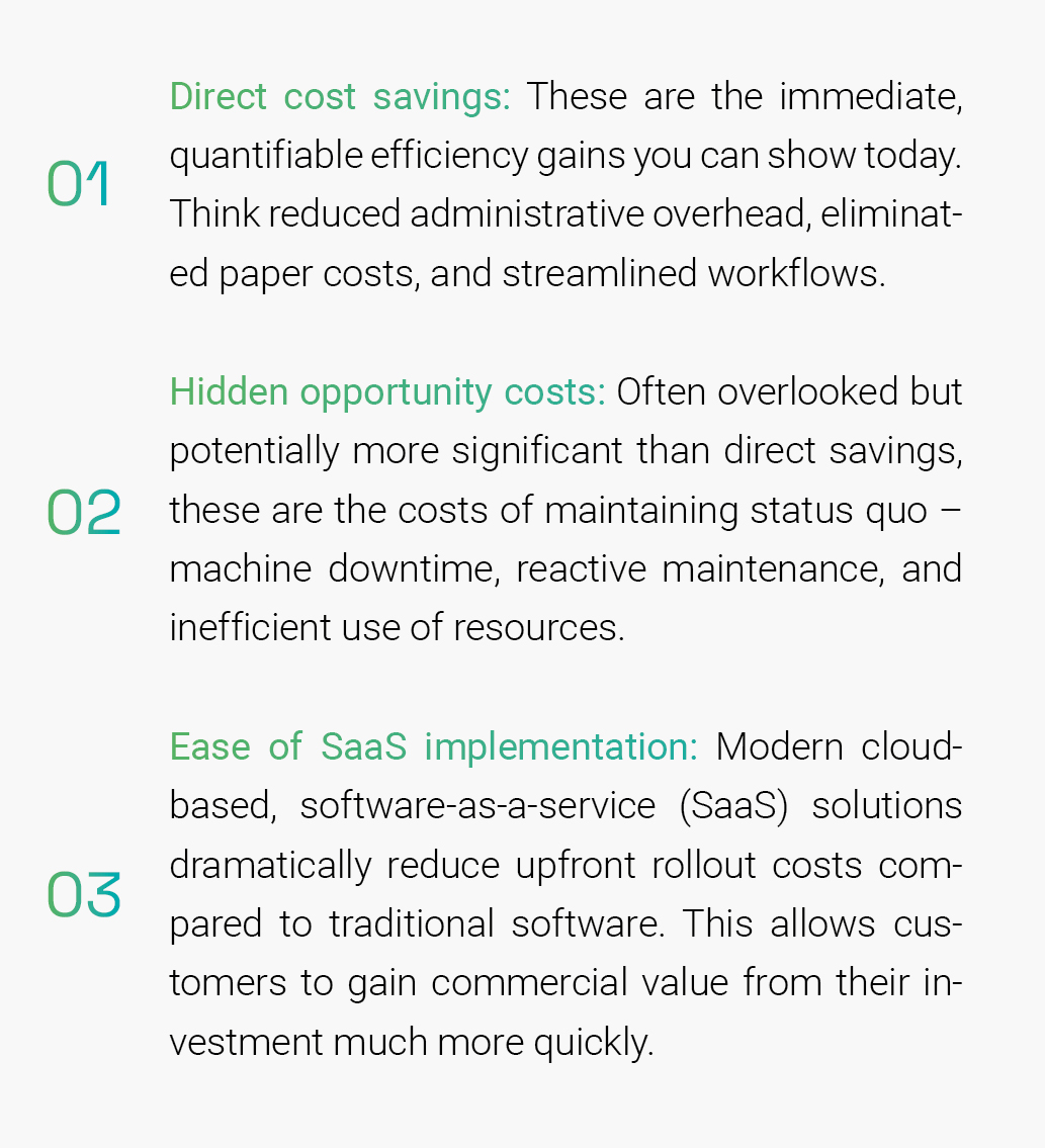 From unplanned downtime to inefficient spare parts usage, we help you identify the costs of doing nothing — and frame them in a way that gets attention. - Why SaaS makes implementation easier than ever