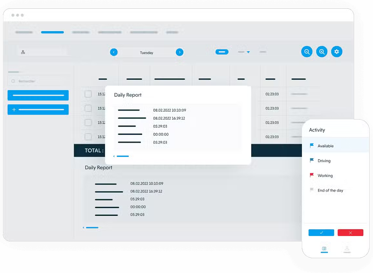 - Echtzeit-Steuerung für die Dispo: Live-Standorte auf der Karte, Cockpit fürs Monitoring und automatische Warnungen bei Verzögerungen.