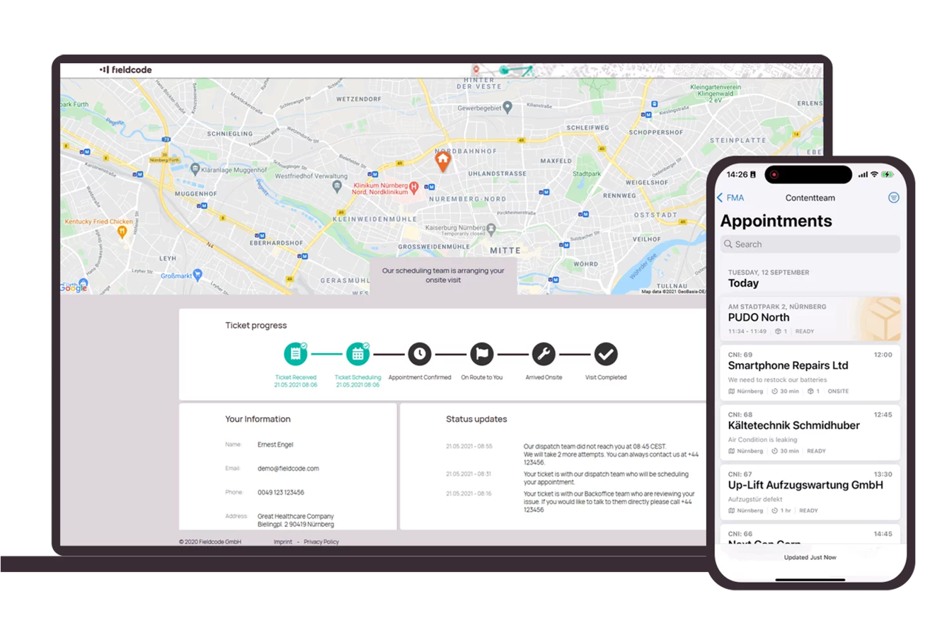 - Kundenkommunikation: Termine werden automatisch bestätigt, die voraussichtliche Ankunftszeit (ETA) wird angekündigt und der Servicebericht folgt direkt nach dem Einsatz.