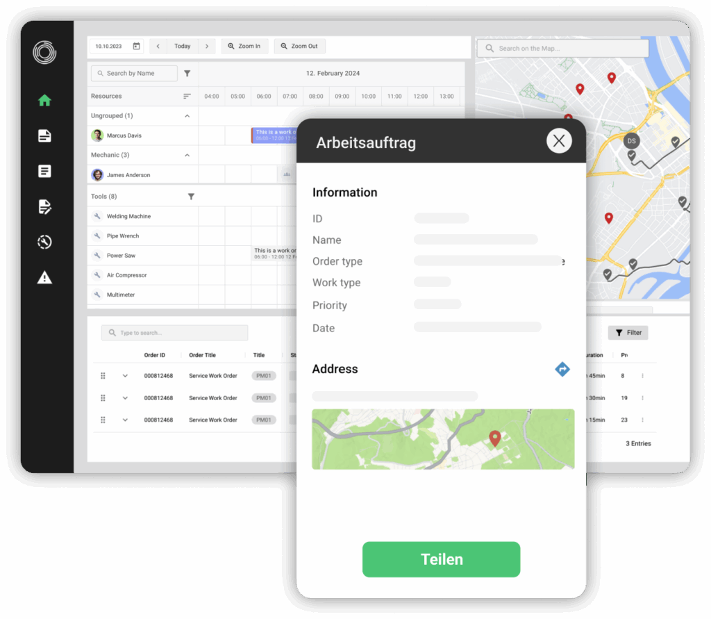 • Planung und Terminierung: Drag-and-Drop-Planung, kompetenzbasierte Zuweisung und mehrstufige Planungsfunktionen helfen dabei, den Personaleinsatz optimal zu organisieren. Diese Funktionen ermöglichen die Verwaltung von Schichten, Abwesenheiten und Einsatzzeiten – und sorgen in Echtzeit dafür, dass die richtigen Techniker zur richtigen Zeit den passenden Aufgaben zugewiesen werden.