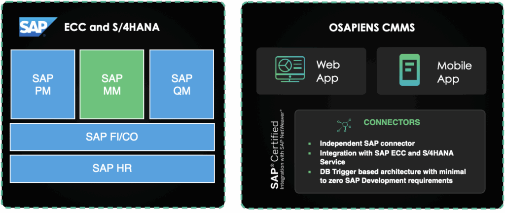 osapiens HUB for Maintenance (CMMS) vereint beides: Eine intuitive, mobile Nutzeroberfläche und gleichzeitig eine nahtlose Integration in SAP-Systeme wie S/4HANA oder ECC.