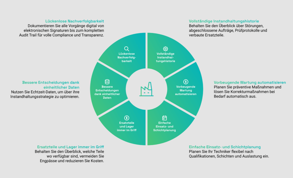 - Instandhaltungsdokumente liegen in Ordnern oder in getrennten Systemen – bei Audits fehlt der schnelle Nachweis der Compliance