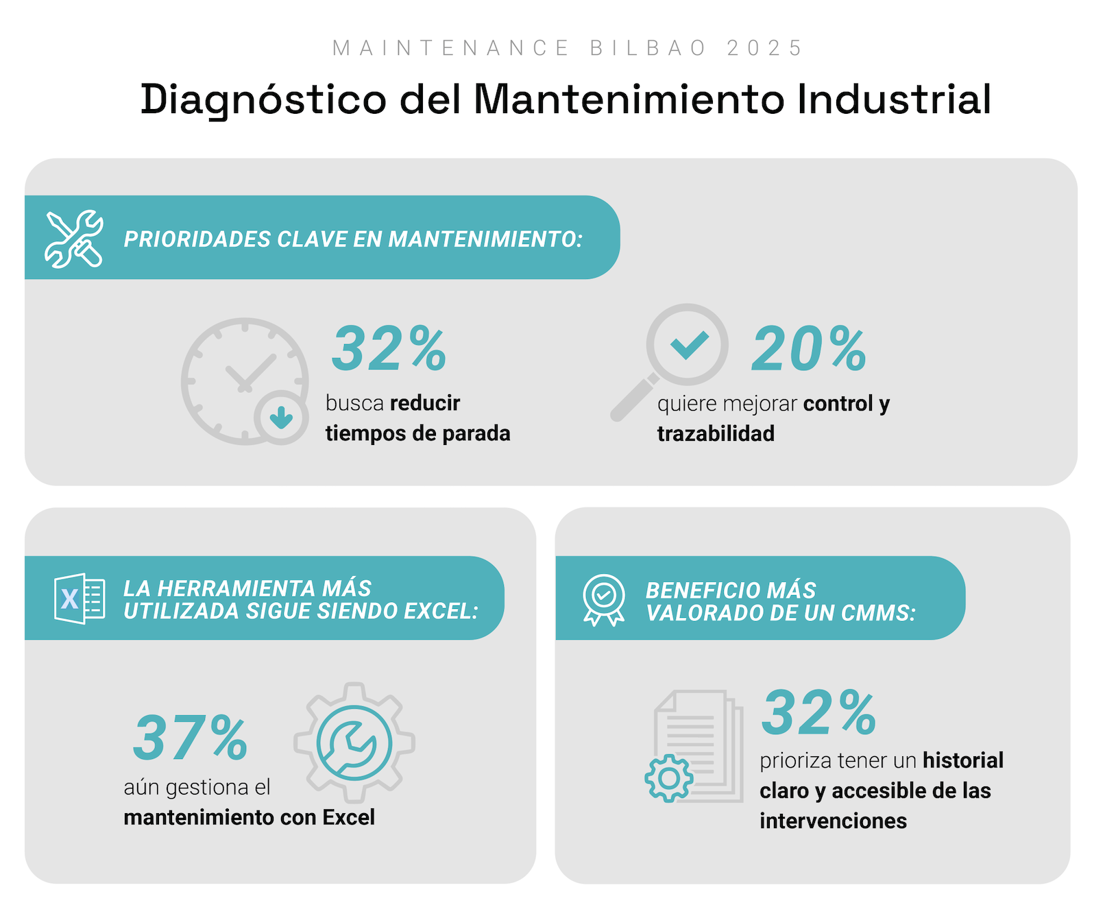 - Un 37% sigue gestionando su mantenimiento con Excel o Google Sheets, mostrando un potencial de mejora enorme mediante herramientas especializadas y adaptadas.